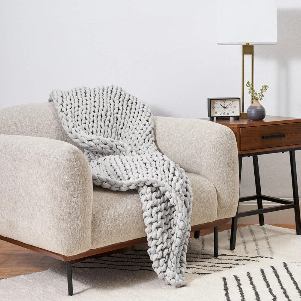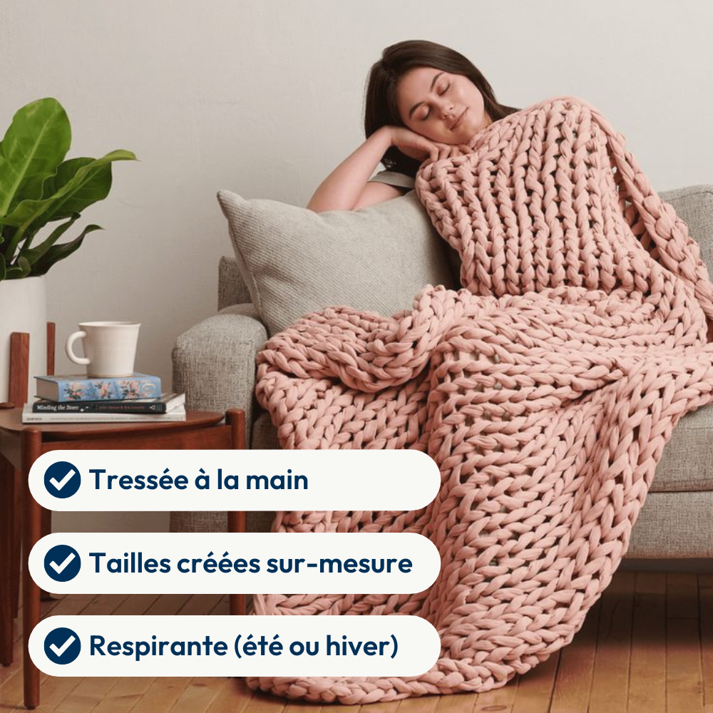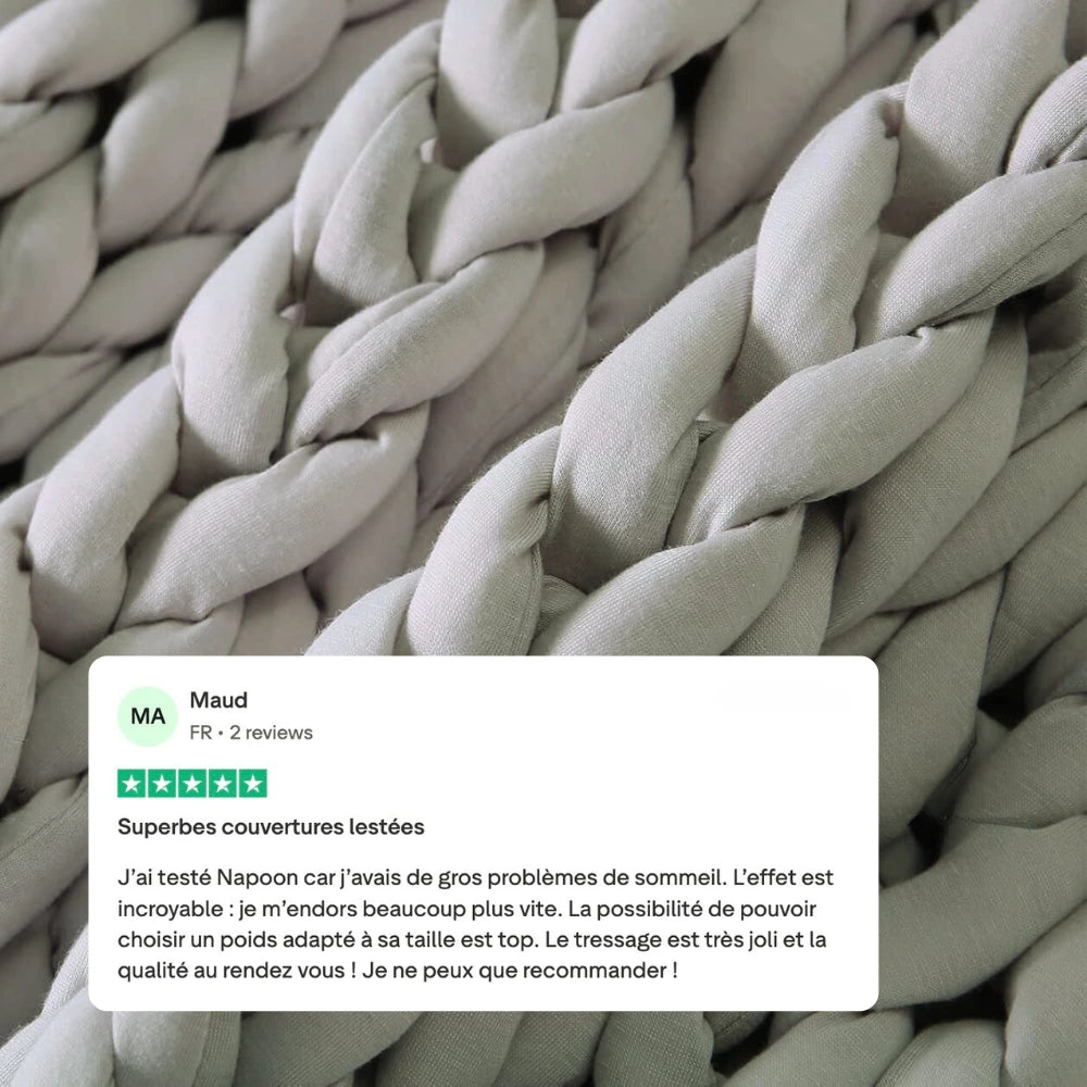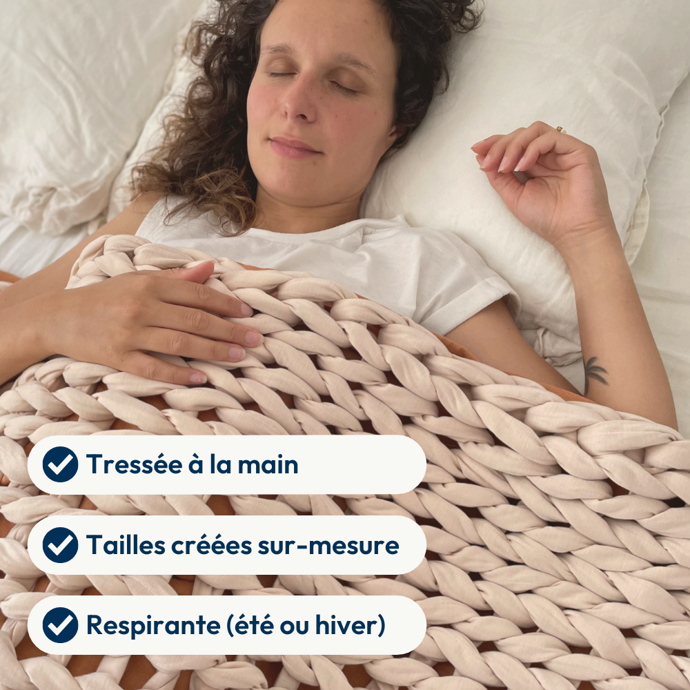 Ce qui rend une couverture lestée insupportable n’est pas le poids : c’est l’absence de respiration (matière synthétique qui gratte ou étouffe). Napoon est composée de coton bio à l’intérieur et à l’extérieur. Son design tressé à mailles ouvertes, rend la couverture respirante et utilisable toute l’année. Vous profitez ainsi des bienfaits apaisants même pendant les chaudes nuits d'été.