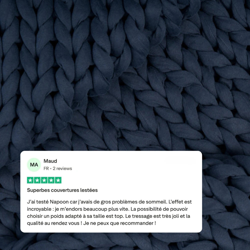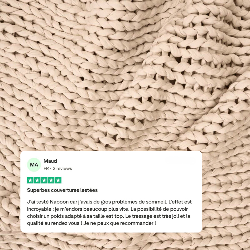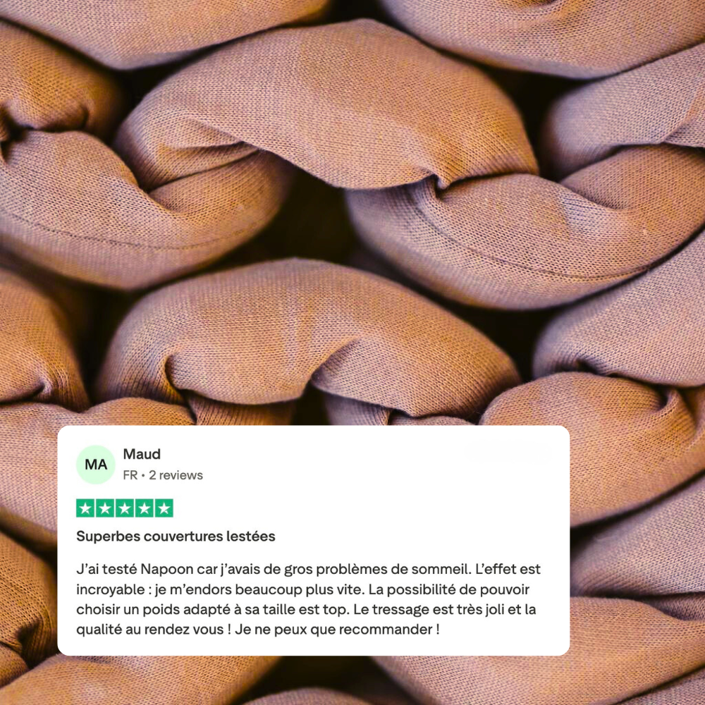 Une couverture lestée ne se choisit pas comme un plaid. La taille de votre Napoon dépend de votre poids, pas de votre lit. L'idéal : environ 10 % de votre poids pour ressentir une pression efficace et apaisante. Trouvez votre Napoon avec notre quizz.